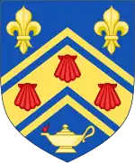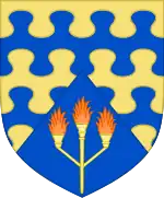 Escutcheon: Azure, a torch fired and enfiled with a ducal coronet Or between on the dexter a rose argent, barbed and seeded proper, and on the sinister a fleur-de-lys of the second; on a chief wavy of the third a dove of the first.