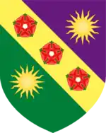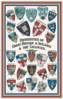 University and college arms often incorporate, or are simply copies of, arms of their founders or local authorities.[2][3][11] At collegiate universities, constituent colleges may bear their own arms, such as at Cambridge and Oxford.[2][3] Many older coats of arms were recorded by Arthur Charles Fox-Davies in The Book of Public Arms in 1915, which also recorded some coats of arms of constituent colleges,[12] and by John Woodward in A Treatise on Ecclesiastical Heraldry in 1894.[13] Most university mottos are not granted with the coats of arms, instead being added by custom by the institution, an exception to this being the arms of Imperial College London.[14] Those universities in Ireland that existed prior to independence from the United Kingdom were granted arms along the lines of other British universities;[15] these are listed separately below.