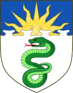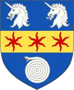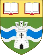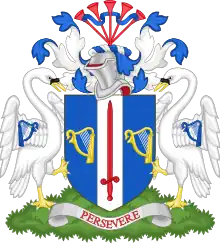 Escutcheon: Per chevron the chief per pale Gules and Azure in dexter a lion rampant with two heads in sinister a mermaid holding in the dexter hand a mirror and in the sinister a comb Or the base Sable charged with an open book Proper with two buckles and straps and edges of the third inscribed "PER ARDUA AD ALTA".