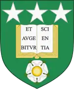 The three stars (mullets) are taken from the arms of the city of Leeds and derived originally from the coat of arms of Sir Thomas Danby who was the first mayor. The open book represents learning. The white rose is a symbol of Yorkshire