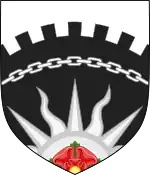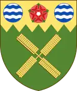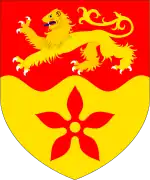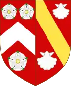 Escutcheon: Per fesse gules and sable, in chief three escallops fessewise or and in base a cross engrailed argent, a rose of the first thorned and seeded proper.