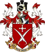 Escutcheon: Gules, an open book strapped proper and buckled and inscribed with the words "Ut Vitam Habeant" in letters Or, between in chief two cinquefoils pierced ermine and in base a horse shoe also Or.