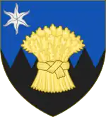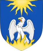 Escutcheon: Per fess nebuly enhanced Bleu-celeste and Purpure issuant in chief a sun in Splendour or in base three bees volant Proper.