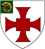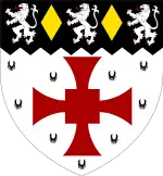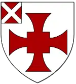 Escutcheon: Argent a Cross Pattée quadrate Gules; a Canton Azure charged with a Chevron Or between three Lions rampant of the First.