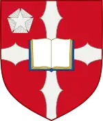 Escutcheon: Argent on a cross Gules the union rose irradiated and ensigned with the imperial crown Proper a chief Azure thereon an open book also Proper the clasps Gold.