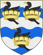 Escutcheon: Azure an open book Argent inscribed "FIAT LUX" in letters Sable bound and on the sinister side seven clasps Or between three cormorants otherwise called Livers wings elevated of the second each holding in the beak a branch of seaweed called Laver proper.