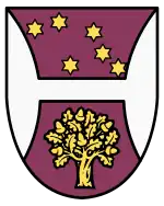 Crest: On a wreath of the colours, On a mount vert an oak tree proper, fructed Or, between two garbs resting against the trunk gold.