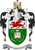 Crest: Upon a Helm a Wreath of the colours a Dragon statant Gules resting the dexter claw on an open book Proper inscribed with the words "GOREU AWEN GWIRIONEDD"[26][27]