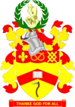 Escutcheon: Vert an open book Proper edged and clasped Gold inscribed with the words "ET AUGEBITUR SCIENTIA" between in chief three mullets Argent and in base a rose of the last seeded Proper.