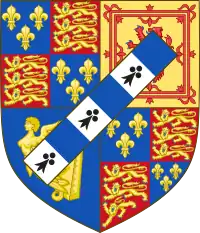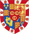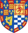 Quarterly: I and IV grandquarterly azure three fleurs de lys or (France) and gules three lions passant guardant or (England) ; II or, a lion gules, double tressure flory and counter-flory of the same (Scotland) ; III azure, a harp or, stringed argent (Ireland) ; a baton sinister couped azure compony argent of six pieces, each piece argent charged with an ermine spot sable. |