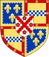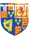 Quarterly: I and IV grandquarterly azure three fleurs de lys or (France) and gules three lions passant guardant or (England); II or, a lion gules, double tressure flory and counter-flory of the same (Scotland) ; III azure, a harp or, stringed argent (Ireland); a bordure compony of twelve pieces azure and gules, each piece azure charged with a fleur-de-lys and each piece gules charged with a lion passant guardant or.