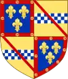 Quarterly, I and IV grandquarterly: 1 and 4 azure three fleurs de lys or and 2 and 3 gules three lions passant guardant or; II or, a lion gules, double tressure flory and counter-flory of the same and III azure, a harp or, stringed argent; overall a label argent. |
