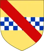 Or, a fess chequy azure and argent, a baton gules.[2] |