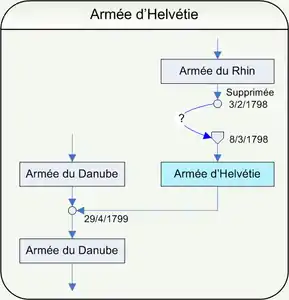 The Army of Helvetia, or (French: Armée d'Helvétie), was a command of the French Revolutionary Army. It was formed on 8 March 1798 from the remnants of the first unit to be known as the Army of the Rhine. It was officially merged into the command structure of the Army of the Danube on 29 April 1799, although it continued to operate in the Swiss theater until 1801. The Army's initial campaigning in the old Swiss Confederation resulted in severe setbacks and defeats at Feldkirch, Lusiensteig, and Zurich.