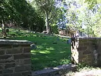 The burial grounds are still in use and pre-date the meeting house by many years. Meeting records indicate settlement in the area before the first petition to Burlington Monthly Meeting to build this existing building in 1743. The stone wall, built in 1860, encloses only a portion of the grave as many persons were literally buried "outside the wall" having lost favor with the Meeting, or were buried elsewhere on the grounds in unmarked sites before the walls were constructed.[1]