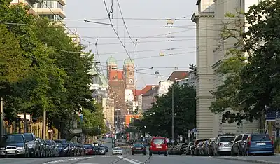 The Arnulfstraße is a 3.8 km long urban street in Munich. It leads from the Bahnhofplatz in the Ludwigsvorstadt through the Maxvorstadt (north of the railway) west to Romanplatz in Neuhausen. Over the Hackerbrücke, there is a connection to the Landsberger Straße, which runs parallel to the south of the railway tracks. Until 1983, the tram line 3 drove through the Arnulfstraße. It was initially diverted in the course of the Munich S-Bahn construction and then shut down. In 1996, the tram service was reopened on the Arnulfstraße with the line number 17.[1]
