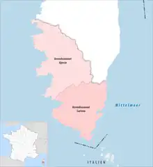 In 1800 the arrondissements of Ajaccio and Sartène were established as part of the department Liamone. Between 1811 and 1976 these arrondissements were part of the department Corse, since 1976 they have been arrondissements of the department Corse-du-Sud.[2] In March 2017 the commune Olivese was assigned from the arrondissement of Sartène to the arrondissement of Ajaccio.[3]