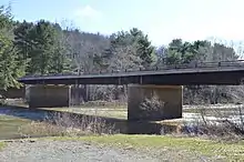 The second Arroyo Bridge (1901-2004), a three-span, metal Pratt Truss bridge, 287 feet (87 m) long, built by the Nelson and Buchanan company of Pittsburgh and Chambersburg, Pennsylvania, crossed the Clarion River here. This bridge was built to replace the Arroyo Bridge Company's toll bridge. Squire Webster, the toll master, lived at one end of the bridge and collected the tolls from travelers. A family with a horse and wagon could cross for 10 cents. The bridge was such an important structure in the town that dances and parties were held on its deck during Arroyo's heyday. In the early 2000s, the Arroyo Bridge was replaced again.