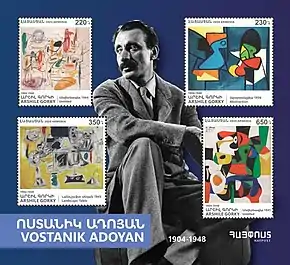 A 2020 stamp sheet of Armenia featuring Gorky and his paintings Untitled (1944), Abstraction (1936), Landscape-Table (1945) and Untitled (1941)