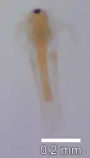 Males have two reproductive organs. Prior to copulation, the male clasps the female with his clasping organ, assuming a dorsal position. The claspers hold the female just anterior to the ovisac. A male and female may swim clasped together for a number of days. In this state, the movements of the swimming appendages of the pair beat in a co-ordinated fashion.[4] The females can produce eggs either as a result of mating or via parthenogenesis. There are two types of eggs: thin-shelled eggs that hatch immediately and thick-shelled eggs, which can remain in a dormant state. These cysts can last for a number of years, and hatch when they are placed in saltwater. Thick-shelled eggs are produced when the body of water is drying out, food is scarce, and the salt concentration is rising. If the female dies, the eggs develop further. Eggs hatch into nauplii that are about 0.5 mm in length. They have a single simple eye that only senses the presence and direction of light. Nauplii swim towards the light, but adults swim away from it. Later, the two more capable eyes develop, but the initial eye also stays, resulting in three-eyed creatures.[5][6]