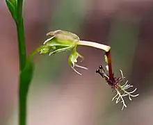 In 2002 David Jones and Mark Clements raised the subspecies nothofagicola to species status as Thynninorchis nothofagicola but the name has not been accepted by some authorities.[13][14] The two subspecies of Arthrochilus huntianus differ from other orchids in the genus by being leafless and having the labellum dangling with an insect-like "lure" on the end.[2]