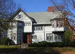 This house was designed by architect William Lofgren and built in 1909 for Arthur Alden, an executive in financial services companies based in Quincy. The building is a well-executed and preserved example of Queen Anne styling, with its asymmetrical facade, variety of protruding elements, and varied window types. It is the most architecturally sophisticated house on Whitney Road, which was developed residentially in the early 20th century for middle-to-upper class residents, most of whom worked in Quincy.[2]