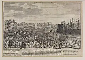 Balmerino went to his execution unrepentant, stating "If I had a thousand lives, I would lay them all down in the same cause".[8] His insouciant attitude at the time of his trial and execution -joking with bystanders and insisting on taking the axe in his carriage so that Kilmarnock would not be bothered by it - was widely reported in the media of the time.[9] Horace Walpole, in a letter, described him as "the most natural brave old fellow I ever saw [...] at the bar he behaved like a soldier and a man: in the intervals of form, with carelessness and humour".[8] Balmerino's execution is sometimes reported to have taken three blows, though "the first certainly took away all sensation".[10][8] Like Kilmarnock, he was buried in the Church of St Peter ad Vincula in the Tower of London: reportedly, at his request, alongside William Murray, Marquess of Tullibardine.