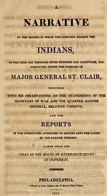 Although an investigation exonerated him, St. Clair resigned his army commission in March 1792 at the request of President Washington, but he continued to serve as Governor of the Northwest Territory.[7][8][9]