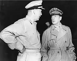 Radford was an admirer of MacArthur and a proponent of his "Asia First" strategy.[33] He supported Operation Chromite in October 1950,[34][35] as well as the United Nations mission of Korean reunification. He attended the Wake Island Conference between MacArthur and Truman on 15 October, and later recalled his belief that, should the Chinese intervene in the war, the U.S. could still prevail provided it was able to strike Chinese People's Liberation Army bases in Manchuria with air power. When the People's Volunteer Army did intervene in favor of North Korea the next month, Radford shared MacArthur's frustration at restrictions placed on the UN force in the war preventing it from striking Chinese soil. Once Truman relieved MacArthur in April 1951, Radford reportedly gave the general a "hero's welcome" in Hawaii as he was returning to the United States.[33]