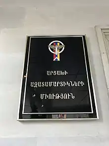 The Artsakh Freedom Fighters Union (Armenian: Արցախի ազատամարտիկների միություն) is a military veterans organization of the Artsakh Defence Army. It serves as an organization that honours Soviet/Armenian veterans of war, whether they hail from Armenia or the Artsakh Republic. It was established on 23 February (the traditional Defender of the Fatherland Day holiday) in the year 2000. On Shushi Liberation Day in 2013, a newly erected building for the union was opened on Renaissance Square.[1] On 2 April 2016, an independent battalion was formed adjacent to the union building. It is community association, operating n 181 communities of the country. The union has a youth wing called Hayrenyats Pashtpan (Motherland Defender), which was established in April 2006. In 2007, personnel of the union took part in the Liberation Day military parade for the first time.[2] The main purpose is to render financial assistance to the families of dead soldiers and living veterans of the Second world War, the First Nagorno-Karabakh War and the 2016 Nagorno-Karabakh clashes.[3]