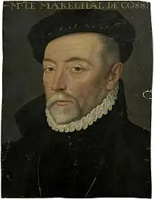 As a man of politique leanings, when informed of the plan to arrest the Huguenot leadership and revoke the Peace of Longjumeau that had ended the second civil war, he was hesitant to enforce the orders.[16] Once formal civil war had resumed however, he would serve the crown loyally, first assisting with 15 companies of men-at-arms and 2000 footmen in the effort to guard the frontier in Picardy from penetration by Prince of Orange. This would be a failure, and he would enter France in December 1568.[17] Nevertheless in this capacity he would be responsible for handing over several prisoners to the Duke of Alba for punishment.[18] He would then move south, fighting alongside the Duke of Montpensier, successfully crushing the viscounts of Quercy and Languedoc when they sought to reach junction with the army under the Prince of Condé in Périgord.[19] In October 1569, Cossé's forces were present at the decisive Battle of Moncontour and played a critical role in the crowns victory.[20] After the destruction of the Protestant army Cossė was among those advocating for the king to seize the moment to gain a favourable peace, the crown was however uninterested, and set about sieging St. Jean-d'Angély in what would prove a costly battle of attrition.[21] As the siege dragged on with little progress, the king reconsidered the proposal, and Cossé was sent with de Losses to meet with Jeanne d'Albret in La Rochelle to talk terms, however she was uninterested.[22] In early 1570, Cossé was tasked with seizing the strategic city of La Charité, to deny the Huguenots their primary means of communication across the Loire river.[23] As Coligny marched on Paris in the final months of the war, Cossé's army would be defeated during their attempt to intercept him at the Battle of Arnay-le-Duc in June.[24]