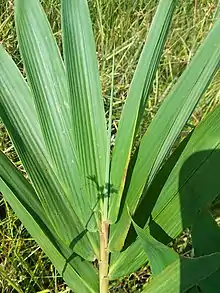 Arundinaria species have running rhizomes and have slender, woody culms that reach heights from 0.5 to 8 metres (1.6 to 26.2 ft). Arundinaria produce seeds only rarely and usually reproduce vegetatively, forming large clonal genets. When seed production does occur, the colony usually dies afterwards, possibly because the dense thickets of a mature canebrake would otherwise prevent seedling establishment. Only two flowering events are known for A. appalachiana.[9] A colony of cane will expand rapidly using asexual reproduction following disturbances, particularly fire, which triggers new shoots to immediately sprout from the underground rhizomes after the above-ground part of the plant has burned. These shoots grow quickly, up to 1.5 inches per day.[10] Among the distinctive features of the canes is a fan-like cluster of leaves at the top of new stems called a topknot, so-called because of its resemblance to topknot hairstyles.[6][7]