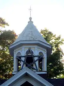 The Arvon Township Hall is a symmetric two-story rectangular building of frame construction on a concrete foundation.[3] The first story is covered with brown-stained shingles and the second with yellow painted horizontal board siding. The hipped roof features a decorative six-sided cupola, dominating the facade, topped with pyramid roof and an iron finial.[3] A central entrance pavilion contains a second story bay over a recessed porch. The entrance is framed with large square pillars, and the porch contains decorative gingerbreading. The windows are symmetrically arranged on both the first and second floors.[2]