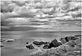 At low tide, there is access to a sand deposit delimited by a rocky wall made from slate and schist forming 30 meters arches resembling cathedral flying buttresses, large caves, sand corridors between rocky blocks, and other geological features. Particularly low tides create access to nearby beaches through the sand extension. As the coast stretch is almost horizontal, the water covers the beach again very quickly.