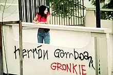 Spray Paint LACMA is Asco's most well-known No Movie. The piece was done in reaction to racial prejudices against Chicanos perpetuated by a curator at the Los Angeles County Museum of Art in 1972. Gamboa met with the curator to discuss the possibility of including Chicano art in future exhibitions, only to be told that Chicanos were incapable of producing anything other than folk art. In response, Asco spray-painted their names onto the outside entrance of LACMA. Utilizing graffiti as a technique alludes to the stereotype of the Chicano as a gang member who vandalizes public spaces. Asco appropriates the technique of graffiti as an assertive means of resistance.[19] Spray Paint LACMA was documented in photos by Gamboa and Valdez and their names were whitewashed within the next day.[1]