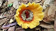 Immature fruit bodies start out as roughly spherical "eggs", 15–20 mm (0.6–0.8 in) in diameter, on or near the surface of the ground. The eggs are white to yellowish, with robust white mycelial cords. The volva is made of an internal, hyaline (translucent), gelatinous layer as well as a membranous structure that is made of branching, hyaline, septate hyphae measuring 3–7 μm in diameter. The stipe is cylindrical, spongy, reddish to pink, 30–40 mm (1.2–1.6 in) high and 5–8 mm (0.2–0.3 in) wide. It has a pseudoparenchymatous structure (compactly interwoven short-celled filaments that resemble the parenchyma of higher plants) made of spherical cells that are 12–45 μm diameter that contain intracellular pigment. The fruit body has the same pseudoparenchymatous cellular morphology. It is sunflower-shaped, pinkish, 15–35 mm (0.6–1.4 in) in diameter, with a perforated central disc that has a reddish edge. It does not have any branches or any vestiges of them, unlike other Aseroe species. It is covered by the gelatinous grayish-brown gleba. The spores are cylindrical to ellipsoid, 4–6 by 1.5–2 μm, smooth, and hyaline. The fruit body, when fresh, smells similar to cow dung.[1] This fetid odor is common to stinkhorn fungi, and attracts insects that help to disperse the spores.[3]