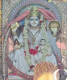 Her temples are also found in other Jadeja domains of Rajkot, Jasdan,[7] Morbi, Gondal, Jamnagar,[8] Ghumli,[8] where the Jadejas, who migrated from Kutch, built her temples and installed her as clan deity.[5][9][10]