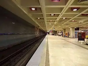 Ashby is a train station in Atlanta, Georgia, serving the Blue and Green lines of the Metropolitan Atlanta Rapid Transit Authority (MARTA) rail system. It incorporates the use of split platforms, where the westbound platform is on the upper level and the eastbound platform is on the lower level. This is to facilitate the Green Line's split toward Bankhead, immediately west of this station.[2]