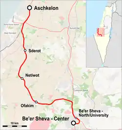 The Ashkelon–Beersheba railway is a railway line linking Ashkelon and Beersheba operated by Israel Railways.[1] It spans approximately 60 km of double track in the northern Negev region of southern Israel and provides rail service to the cities of Sderot, Netivot and Ofakim. The line links Beersheba, Sderot, Netivot, and Ofakim to Ashkelon and Tel Aviv.