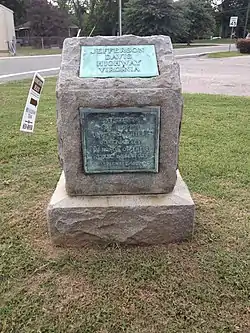 The Jefferson Davis Highway Marker is a commemorative marker on the Jefferson Davis Highway, in Hanover County, Virginia, near Ashland.[1] It is a 42-inch-high (1.1 m) gray granite stone, with a slanted top, with two bronze plaques. The Jefferson Davis Highway was conceived and marked by the United Daughters of the Confederacy, as a counter to the Lincoln Highway in the north, during 1913–1925. In that era, named highways were being marked as automobile travel increased, and the advent of numbered highways eventually loomed. The marker was placed at the junction of what is now US Route 1 and Cedar Lane (Virginia Route 623), between Richmond and Ashland, in 1927. It has been moved twice: in the 1970s it was moved to accommodate the widening of Route 1, and it was moved across Route 1 in the 1980s.[2]