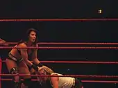 A week later on the August 22, 2005, episode of Raw, Candice Michelle and Torrie Wilson attacked Massaro after pretending to welcome her to the brand.[11] Massaro's storyline feud with Wilson and Michelle continued over the next couple weeks, as the duo, along with their enforcer Victoria (dubbed as the "Skankateers" by commentator Jim Ross), made things difficult for Massaro.[12] Massaro made her in-ring debut on the August 29 episode of Raw, in a losing effort to Victoria.[13] On the September 5 episode of Raw, Massaro was defeated by Wilson due to interference from Victoria and Candice.[1] Massaro evened the score on the September 12 episode of Raw when she brought out the returning Trish Stratus (who then turned face), and the duo proceeded to attack them.[14] On the September 18 episode of Raw, The pair defeated the trio—who became known as the Ladies in Pink (and later Vince's Devils).[1] This led to a tag team match at Unforgiven, where the team of Stratus and Massaro defeated Wilson and Victoria.[15] The following night on Raw, Massaro accompanied Trish where she defeated Wilson. After the match, The duo were attacked by The Vince Devils.[1] The feud continued into WWE Homecoming, where Stratus and Massaro defeated Wilson, Candice, and Victoria in the first ever three on two Bra and Panties match by stripping all three of their opponents.[16] Massaro continued to wrestle matches through the rest of 2005 and was involved in the annual Fulfill Your Fantasy Diva Battle Royal at Taboo Tuesday for her first shot at the WWE Women's Championship.[17] Massaro eliminated Candice Michelle before being eliminated by Victoria.[17]