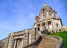 At around 150 feet (50 m) tall, it dominates the Lancaster skyline and is visible for many miles around, and has views of the surrounding area including Morecambe Bay. The building is in the Edwardian Baroque style and was designed by John Belcher. It has been described as "England's grandest folly" and the "Taj Mahal of the North".[3] The dome is externally of copper, the main stone used is Portland stone; however, the steps are of hard wearing granite from Cornwall.