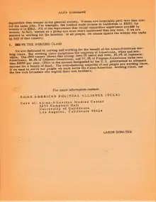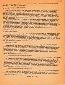 "We Asian-Americans believe that American society has been, and still is, fundamentally a racist society, and that historically we have accommodated ourselves to this society in order to survive...We Asian-Americans support all non-white liberation movements and believe that all minorities in order to be truly liberated must have complete control over the political, economic, and social institutions within their respective communities. We unconditionally, support the struggles of the Afro-American people, the Chicanos, and the American Indians to attain freedom, justice, and equality… We are unconditionally against the war in Vietnam… In conclusion, I would like to add that the Asian American Political Alliance is not just another Sunday social club. We are an action-oriented group, and we will not just restrict our activities to merely ethnic issues, but to all issues that are of fundamental importance pertaining to the building of a new and a better world."[8]