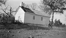 Fiducia Church, after wind damaged it, and a local boy, 1939