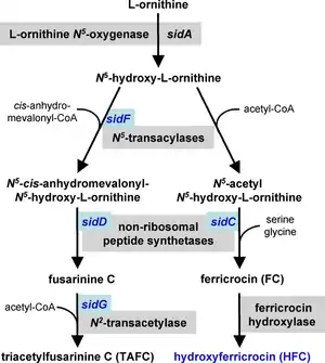 - ↑ Hissen AH, Wan AN, Warwas ML, Pinto LJ, Moore MM (September 2005). "The Aspergillus fumigatus siderophore biosynthetic gene sidA, encoding L-ornithine N5-oxygenase, is required for virulence". Infection and Immunity. 73 (9): 5493–503. doi:10.1128/IAI.73.9.5493-5503.2005. PMC 1231119. PMID 16113265.