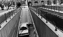 The wreckage of Neave's car on the ramp of the House of Commons' car park