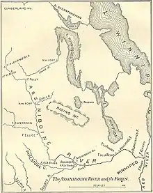 West of Lake Winnipeg is the chain of lakes that look like a single lake on large maps (Cedar Lake (Manitoba), Lake Winnipegosis and Lake Manitoba). West of this is the Assiniboine River. The Assiniboine flows southeast and then the east to Winnipeg, Manitoba where it meets the Red River of the North which flows north into Lake Winnipeg. Further west the Qu'Appelle River flows east to meet the Assiniboine. South of the Qu'Appelle is the Souris River which was not important in the fur trade. East of the upper Assiniboine the Swan River almost reaches the Assiniboine and flows into Lake Winnipegosis. To the southwest is the Mandan country on the upper Missouri. There was some overland trade with the Mandans until the Americans took it over around 1812. North of Lake Winnipeg is the so-called Muskrat Country which was of some importance around 1800.