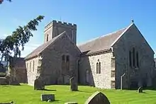 St. Michael and All Angels Church is part of the Church of England under the Diocese of Hereford. It has been a grade II* listed building since 1970.[15] According to surveys by English Heritage, the oldest part of the church is the chancel which is believed to originate from the 12th century, with the roof being updated around the 15th century. The tower was taken down and rebuilt in 1884 after a porch was added in 1639.[16] The building features a monumental slab to John Botterell, added in 1479 and a large canopied monument to him and his wife added in 1588.