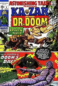 "Ka-Zar" was initially by the longstanding and highly influential team of writer and Marvel editor-in-chief Stan Lee and penciler and co-plotter Jack Kirby, the duo who had introduced the jungle lord years before as a one-issue supporting character in The X-Men. Ka-Zar had since guest-starred in Daredevil and in other series before gaining his first solo feature here. After that initial story, Roy Thomas scripted the second installment, with the team of writer Gerry Conway and penciler Barry Windsor-Smith taking over for issues #3–6.[4] Thomas and signature Hulk artist Herb Trimpe teamed for the next two issues, with Thomas abetted by Mike Friedrich on the latter. Astonishing Tales then starred Ka-Zar solely in stories ranging from 16 to 21 pages each.[2]
