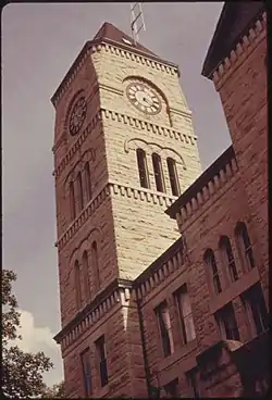 The Atchison County Courthouse, located at the southwest corner of 5th and Parallel Streets in Atchison, is the seat of government of Atchison County, Kansas. The stone courthouse was built from 1896 to 1897 and replaced the county's first courthouse, which had been built in 1859. County officials wanted the courthouse to resemble the Franklin County Courthouse in Ottawa, so they hired that building's architect, George P. Washburn, to design the new courthouse. Washburn designed the building in the Romanesque Revival style. The courthouse's design features four corner towers, including a seven-story clock tower. The main entrance to the courthouse has a porch within a large arch; the doorway is contained in a smaller arch. The building has a hip roof with intersecting gable dormers; the towers have pyramidal roofs.[2]